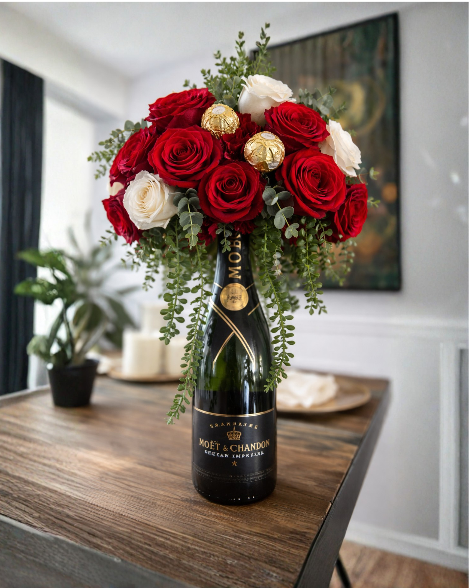 Eleva cualquier ocasión especial con esta sofisticada botella de champaña , coronada con un exquisito arreglo floral y delicados chocolates que aportan un toque irresistible de indulgencia. El precio puede varias segun la marca de la champaña.